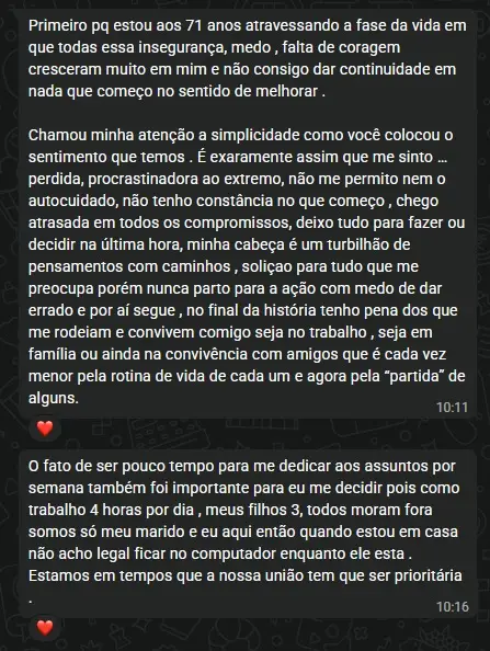 Aqui, você pode trazer situações reais da sua rotina, decisões, travas, recaídas ou momentos de confusão, e receber orientação direta de como aplicar o método naquele contexto específico.